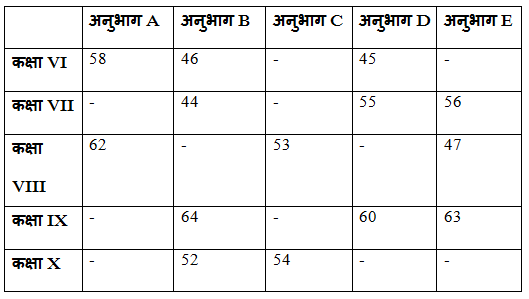 4) यदि सभी दिए गए कक्षा के अनुभाग D में छात्रों की औसत संख्या 55 है और कक्षा XI में अनुभाग D में छात्रों की कुल संख्या कक्षा VIII में अनुभाग D में छात्रों की कुल संख्या से एक अधिक है, तो कक्षा X की अनुभाग D में छात्रों की कुल संख्या ज्ञात कीजिये?