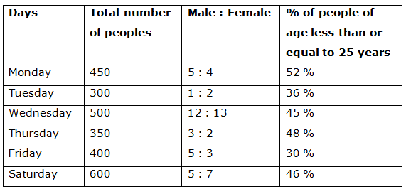 The following table shows the total number of peoples went for a science conference in different days in a week and the ratio of male and female among them and the percentage of people of age less than or equal to 25 years.
