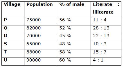 The following table shows the total number of population in different villages and the percentage of male among them and the ratio of literate to illiterate population among them.