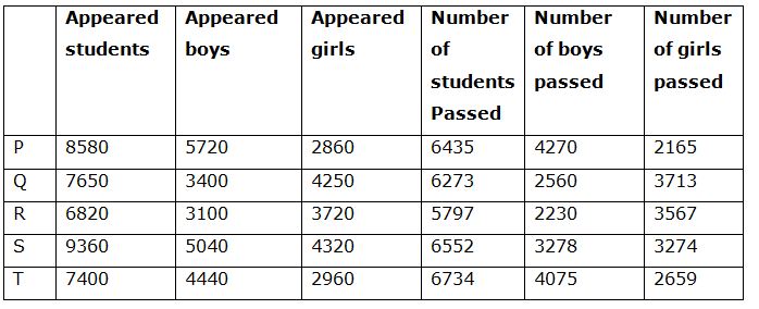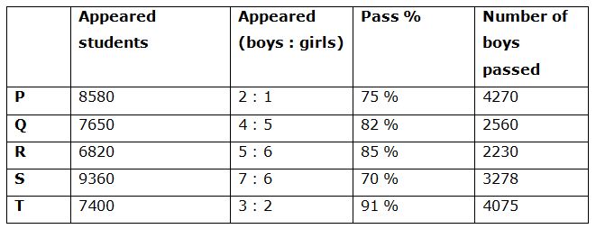Following table shows the total number of students appeared for the examination from different cities and the ratio of appeared boys to girls among them and the percentage of students passed in the examination and number of boys passed in the examination.
