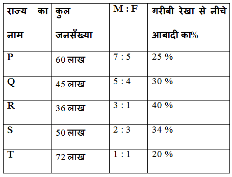 निम्नलिखित तालिका में 5 अलग-अलग राज्यों के कुल आबादी, उनके बीच पुरुष और महिला का अनुपात और गरीबी रेखा से नीचे आबादी का प्रतिशत दिखाती है।