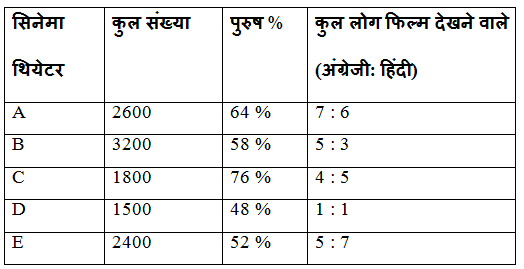 निम्नलिखित तालिका में एक अलग सिनेमा थियेटर में फिल्म के लिए जाने वाले लोगों की संख्या और उनमें से पुरुष का प्रतिशत और थियेटर में अंग्रेजी और हिंदी फिल्म देखने की कुल संख्या का अनुपात दिखाता है।