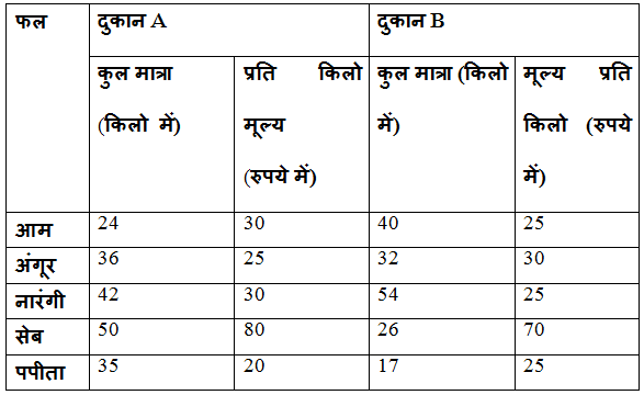 निम्नलिखित तालिका एक निश्चित महीने में विभिन्न दुकानों में विभिन्न प्रकार के फल दिखाती है और फलों की प्रति किलो कीमत भी दी जाती है।