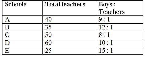 The following table shows the total number of teachers in 5 different schools and the ratio of boys to that of teachers in those schools.