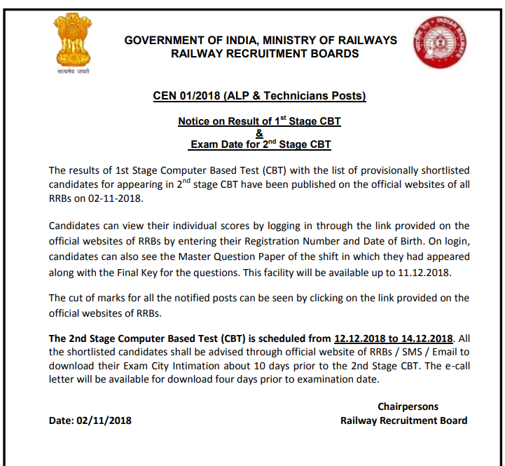 RRB ALP Stage II CBT Exam Dates 12th to 14th December 2018