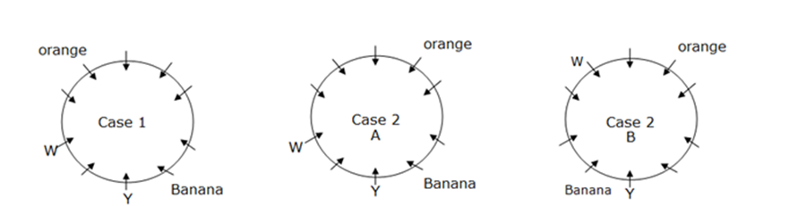Y और वह जो संतरे को पसंद करता है, के बीच तीन व्यक्ति बैठते हैं। वह जो केले को पसंद करता है, W के दाईं ओर से तीसरे स्थान पर बैठता है। W, न तो वह जो संतरे को पसंद करता है और न ही Y का तत्काल पड़ोसी है। W, संतरे को पसंद नहीं करता है। वह जो केले को पसंद करता है और वह जो संतरे को पसंद करता है, तत्काल पड़ोसी नहीं है। Y, केले को पसंद नहीं करता है।