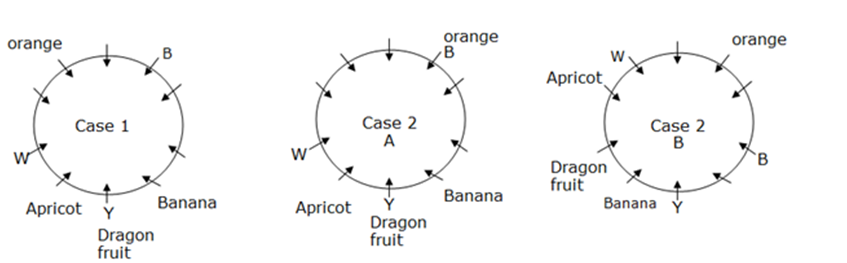 B, ना तो W और ना ही Y का एक तत्काल पड़ोसी है। वह जो ड्रैगन फल को पसंद करता है, B के बाईं ओर से चौथे स्थान पर बैठता है। वह जो खुबानी को पसंद करता है,वह जो ड्रैगन फल को पसंद करता है, के तत्काल बाईं ओर बैठता है। W, न तो खुबानी को पसंद करता है और न ही ड्रैगन फल को पसंद करता है। वह जो संतरे को पसंद करता है और जो खुबानी को पसंद करता है, तत्काल पड़ोसी नहीं है।