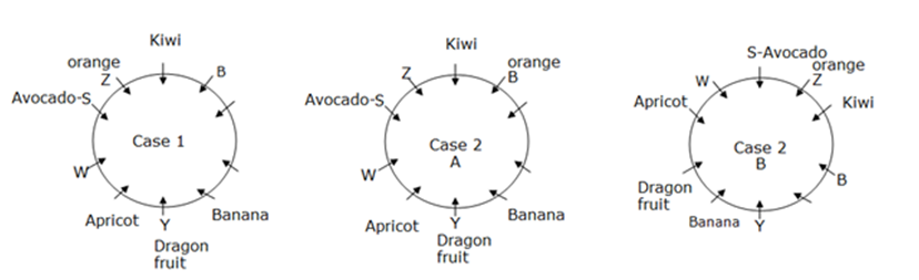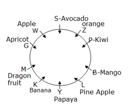 दस व्यक्ति G, L, M, B, W, S, P, K, Z और Y एक वृत्ताकार मेज के चारों ओर केंद्र की ओर मुख करके बैठे हैं। उनमें से प्रत्येक अलग-अलग फल आम, पपीता, संतरा, किवी, खुबानी, केला, अनानास, सेब, ड्रैगन फल और एवोकैडो को पसंद करता है। उपरोक्त सभी जानकारी का इसी क्रम में होना आवश्यक नहीं है।