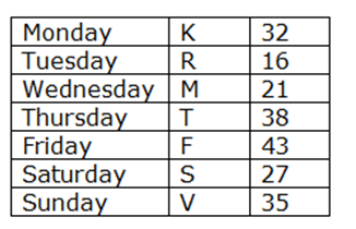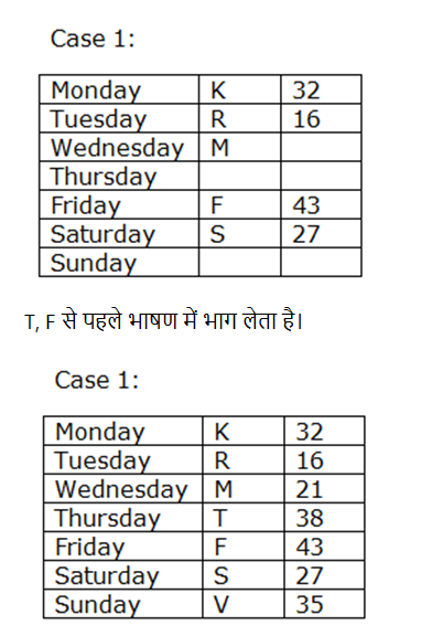 सात व्यक्ति K, F, R, S, T, V और M एक सप्ताह जो सोमवार से शुरू होता है और रविवार को समाप्त होता है में भाषण में भाग लेते हैं। उनमें से प्रत्येक अलग-अलग आयु 16, 38, 43, 27, 32, 35 और 21 में है। विचार कीजिये कि सभी आयु वर्षों में हैं। उपरोक्त सभी जानकारी का इसी क्रम में होना आवश्यक नहीं है।
