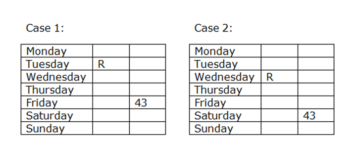 R और वह जिसकी आयु 43 है, के बीच भाषण में दो व्यक्ति भाग लेते हैं। वह जो सबसे बड़ा है, गुरुवार के बाद लेकिन रविवार से पहले पैदा हुआ था।