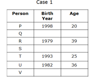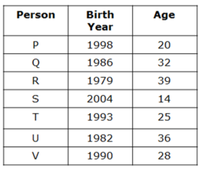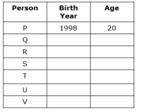 - S की आयु V की आयु से आधी है, जिसकी आयु U के जन्म वर्ष के अंतिम दो अंक है। P और S की आयु का योग Q की आयु से दो अधिक है।