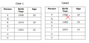 नोट: यदि यह उल्लेख किया गया है कि किसी व्यक्ति की आयु को किसी अन्य व्यक्ति के जन्म वर्ष के अंतिम दो अंक के रूप में माना जाता है, तो यह किसी भी अनुक्रम में होगा। उदाहरण के लिए, यदि X की आयु को Y के जन्म वर्ष का अंतिम दो अंक माना जाता है, जो कि 1945 है; तब X की आयु 45 या 54 हो सकती है।