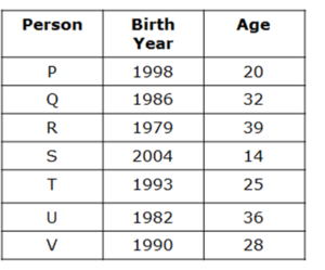 P का जन्म 1998 में हुआ था। P और T की आयु में 5 वर्ष का अंतर है। R की आयु T के जन्म वर्ष के अंतिम दो अंकों के बराबर है और उसकी आयु एक सम संख्या नहीं है। U की आयु T की आयु और R की आयु के बीच एक वर्ग संख्या है। S की आयु V की आयु से आधी है, जिसकी आयु U के जन्म वर्ष के अंतिम दो अंक है। P और S की आयु का योग Q की आयु से दो अधिक है।