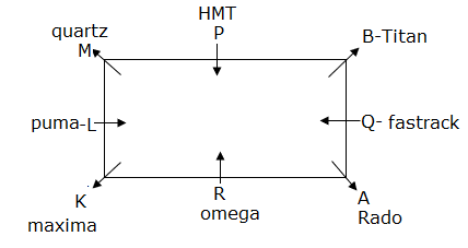Eight persons K, L, M, P, Q, R, A and B are sitting around a rectangular table. Four persons sit at corner and four persons sit at middle side of the table. Person those sitting at corner faces away from the centre and Person those sitting at middle side of the table faces centre. Each one of them likes watches of different brand Titan, Rado, Puma, Quartz, Fastrack, Maxima, HMT and Omega but not necessarily in the same order.