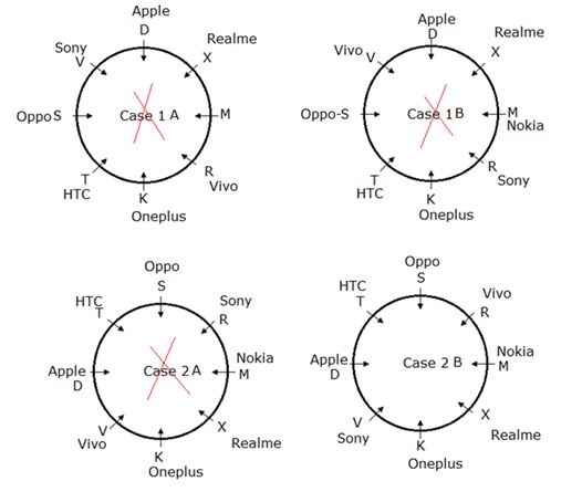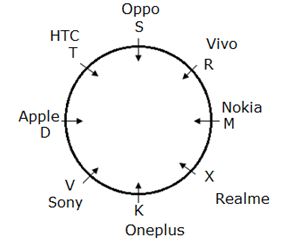 Eight persons are sitting around a circular table faces centre. Each one of them has different mobile Oppo, Vivo, Nokia, Sony, Realme, One plus, HTC and Apple but not necessarily in the same order.