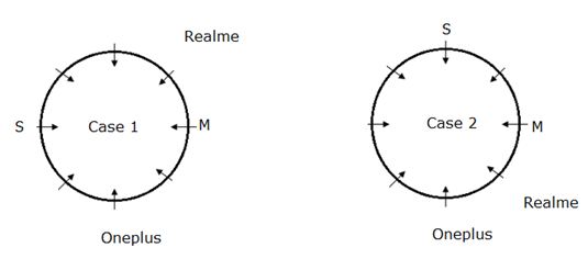 M sits second to the right of the one who has One plus. S is an immediate neighbour of neither M nor the one who has One plus. The one who has real me sits third to the left of S. M does not have realme.