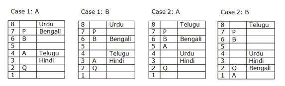 Q lives immediately below the one who speaks Hindi. As many persons live below Q lives above P, who lives above Q. Three persons live between P and the one who speaks Hindi. P does not speak Hindi. As many persons live between P and the one who speaks Telugu live between A and the one who speaks Bengali, who lives above A. A does not speak Urdu.