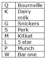 Box K is kept second from the top. Only one box is kept between Box M and the box which contains snickers. Box M is kept neither adjacent to Box K nor adjacent to the box which contains munch. As many boxes kept between Box Q and the box which contains perk is kept between Box W and the box which contains Kitkat. More than three boxes are kept between Box K and the box which contains Munch. Box which contains perk is kept immediately below the box which contains snickers. Box M is kept above box L, but not contain munch. Three boxes are kept between Box L and the box which contains Dairy milk. As many boxes kept above Box Q kept below Box W. Box P is kept above Box W. Snickers is placed above M. Two boxes are kept between Box S and the box which contains Bournville. Box K does not contain snickers. Box G is kept above Box S. Box Q does not contain Kitkat. Neither Box L nor Box Q does not contain Bar one. At most one box placed between Munch and Kitkat.