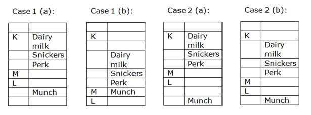 Only one box is kept between Box M and the box which contains snickers. Box M is kept neither adjacent to Box K nor adjacent to the box which contains munch. Box K does not contain snickers. Box which contains perk is kept immediately below the box which contains snickers. Box M is kept above box L, but not contain munch. Three boxes are kept between Box L and the box which contains Dairy milk. Snickers is placed above M.