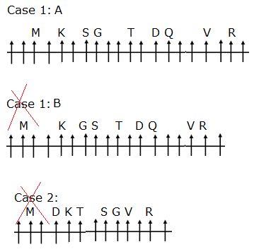 Certain numbers of persons are sitting in a row facing north. Two persons sit between G and T. Number of persons sit between M and D is one more than number of persons sit between G and V. Q sits exactly between T and V. At least one person sits between G and D. As many persons sit between G and D sit to the left of K. S and G are immediate neighbors. K sits between M and S. Not more than two persons sit to the left of M. Only one person sits between V and R, who sits second from right end. More than one but less than four persons sit between D and V. Only one person sits between T and D. More than four persons sit between S and Q.