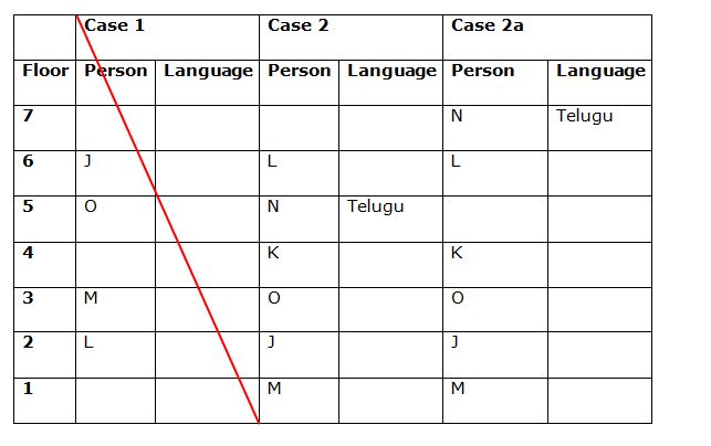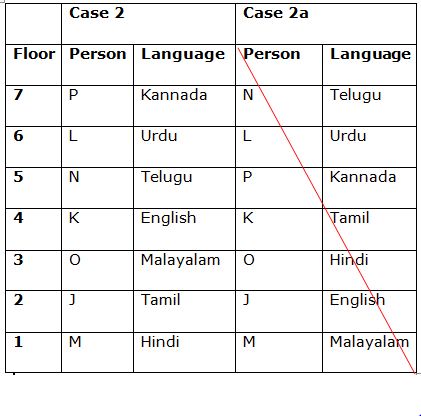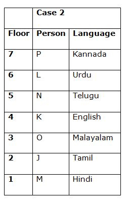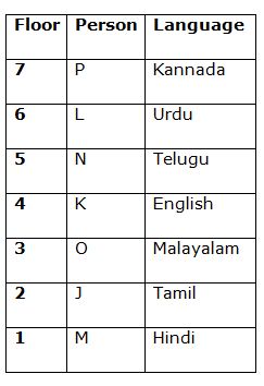 Seven persons J, K, L, M, N, O and P lives in the building. The top most floor is numbered as 7th and the bottom floor is 1st and so on. Each person speaks specific language such as English, Hindi, Kannada, Malayalam, Tamil, Telugu and Urdu.