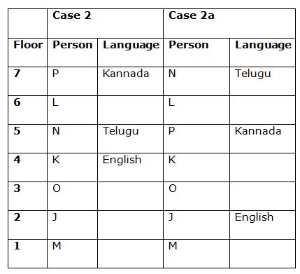 Three floors between L and J who lives in even numbered floor. K’s floor is three above of M’s floor. Two person’s lives between the one who speak English and one speak Kannada. The person who speaks Urdu lives in the even numbered floor. Two floors are between L and O floors. Three persons between the one speak Telugu and the one who speak Hindi. The one who speaks Tamil lives immediately above the floor of the one who speaks Hindi. N speaks Telugu and lives in odd numbered floor. M lives two below of O’s floor. One person lives between N and P who speak Kannada. The one who speaks Kannada and Tamil are not immediate neighbours.
