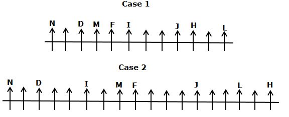 Certain number of persons sitting in a linear row facing north. Two persons sits between I and D. L sits 3rd to the right of J. I sits 2nd to either right or left of M. N sits at one end and 2nd to the left of D. The number of persons between N and M is same as between I and J. H sits 2nd from one end. Some persons between F and D is one more than persons between J and H who sits right of J. Number of persons in the line are more than square of persons between I and N. F sits immediate right of M.