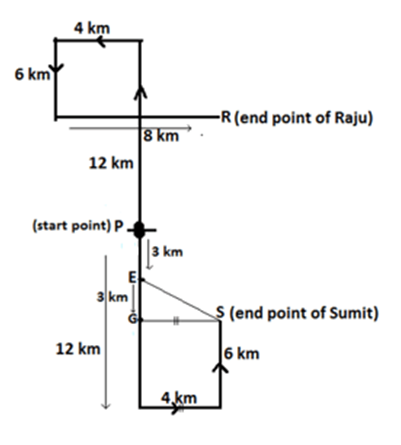 Two friends Raju and Sumit start walking from the same place, Raju covered a distance of 12 km from point P walking in the north direction. He then took a left turn and walk for 4 km. He again took a left turn and walk for 6 km. He again turns to his left and walks for 8 km to reach at a final point R. Likewise, Sumit covered a distance of 12 km from point P walking in the south direction. He then took a left turn and walks for 4 km. He again turns to his left and walks for 6 km to reach at a final point S.