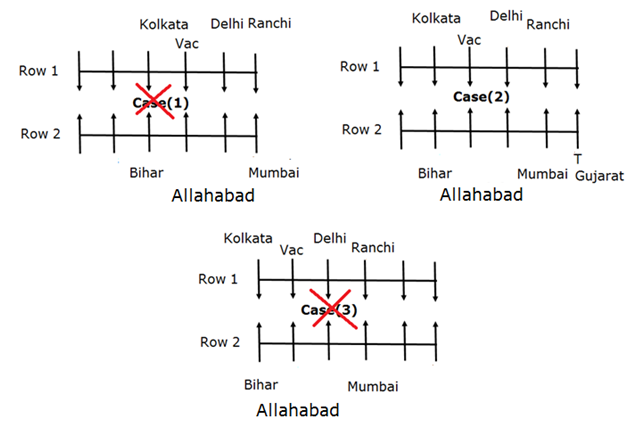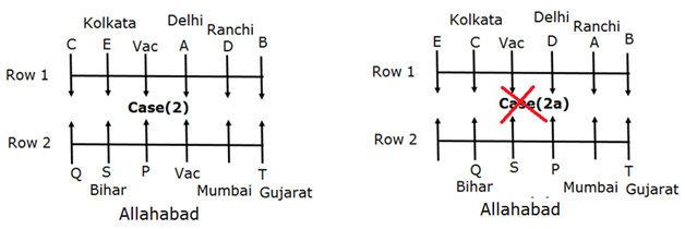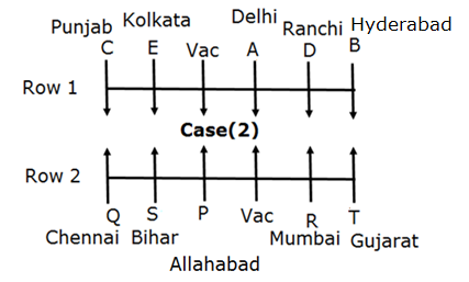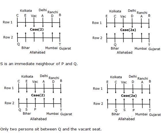S is an immediate neighbour of P and Q. The one who is from Mumbai faces the person who is from Ranchi. The person from Bihar sits third to the left of the one from Mumbai. The vacant seat of the first row is on the immediate left of one who faces the person from Bihar. The one from Kolkata sits third to the right of the one who faces the person from Mumbai. Only two persons sit between Q and the vacant seat. B sits on the immediate left of the one from Ranchi. The one who is from Punjab is not a neighbour of the one from Ranchi. Q faces C, who sits third to the right of A and D is one of the immediate neighbour of A. The person from Delhi sits on the immediate left of the vacant seat of the 1st row. The vacant position of 1st row faces the one from Allahabad. T sits on a extreme end of the row and he is from Gujarat. The one who faces T is an immediate neighbour of the person from Ranchi. The person from Allahabad doesn’t face south. The person neither from Hyderabad nor from Punjab faces north.