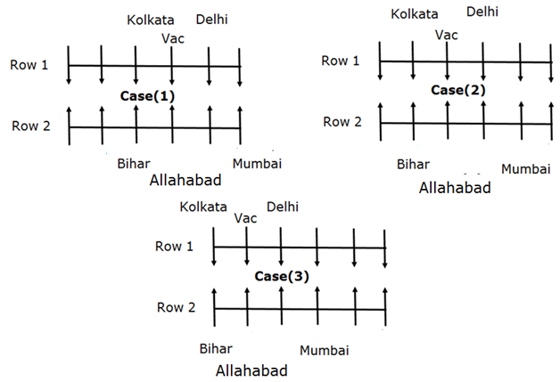 The person from Delhi sits on the immediate left of the vacant seat of the 1st row. The vacant position of 1st row faces the one from Allahabad. The person from Allahabad doesn’t face south.