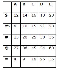 Signals A is =E%E#D@D$C is 36 28 30 54 16. 1st and last number is a perfect square from even numbers. So, the 10th digits of all numbers are multiplied to produce numeric values.