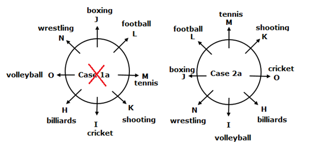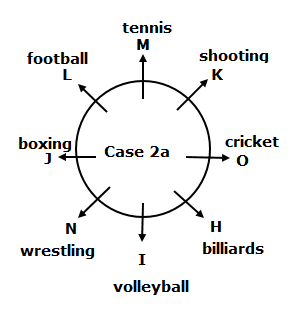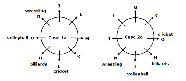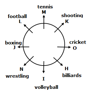 Eight persons H, I, J, K, L, M, N and O sits in the circular table. All are facing towards outside the circle. They are from different games like Billiards, Boxing, Cricket, Football, Shooting, Tennis, Volleyball and Wrestling.