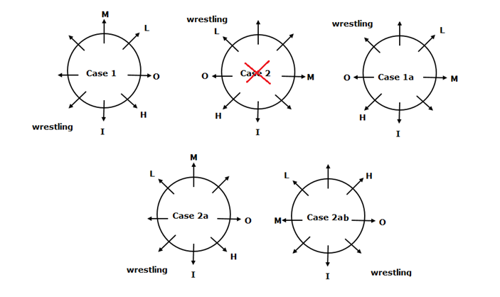 H@O is H sits immediate to O, M$H is M sits 3rd to the left of H, W*H is person who from wrestling sits 2nd to the right of H. L+W is L does not from wrestling.