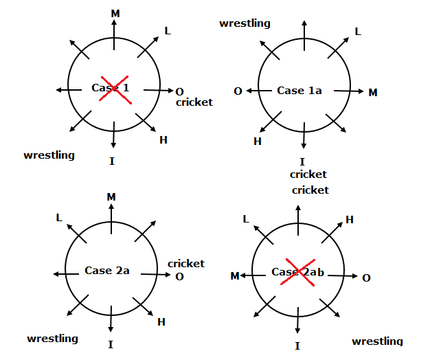R$W is person from cricket sits 3rd to the left of person from wrestling. L#R is L is not immediate to the person from Cricket.
