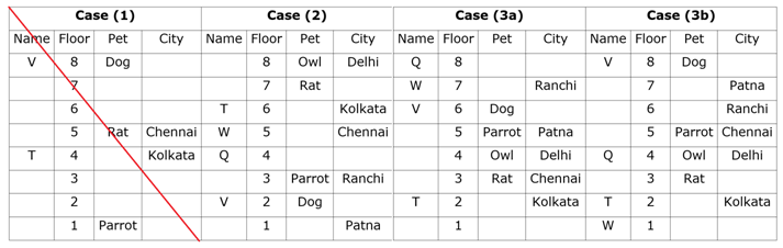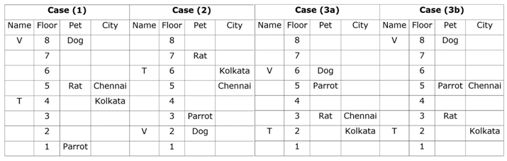 - At least three person lives between one who belongs to Kolkata and V, who lives on even numbered floor and also likes Dog, that means we have four possible place for V, in case (1) V lives on floor marked 8, in case (2) V lives on floor marked 2, in case (3a) V lives on floor marked 6, in case (3b) V lives on floor marked 8.