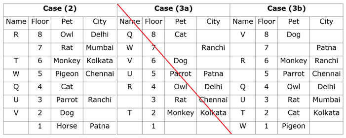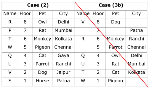 - One who belongs to Delhi does lives at a gap of two floors from W, who neither belongs to Patna nor he like Rat, that means in case (2) one who likes Owl lives on floor marked 8, in case (3a) one who likes Owl lives on floor marked 4, in case (3b) one who likes Owl lives on floor marked 4.