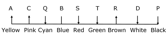 Persons at the end of row are facing opposite direction to each other. One who likes Blue sits third to right of A. Only three people sits between one who likes Red and P, who neither sits adjacent to the one who likes Brown nor does he like Yellow. Either P or the person who likes Yellow sits at end of the row. Only one person sits between R and one who likes Black, who sits facing south. B, who neither sits adjacent to C nor sits adjacent to T, sits fourth to right of D who likes White. T, who neither likes Brown nor sits adjacent to B, sits third to the left of the one who likes Cyan. At least three people sit between T and the one who likes Yellow. One who likes white sits third to left of S, who neither likes Yellow nor sits adjacent to Q. C who likes Pink, neither sits adjacent to the one who likes Green nor sits adjacent to P. P sits third to right of the one who likes Red. D and one who likes Brown sits together. One who likes Cyan sits immediate right of one who likes Pink. Q sits fourth to the left of R, who sits to the immediate left of the one who likes Green.