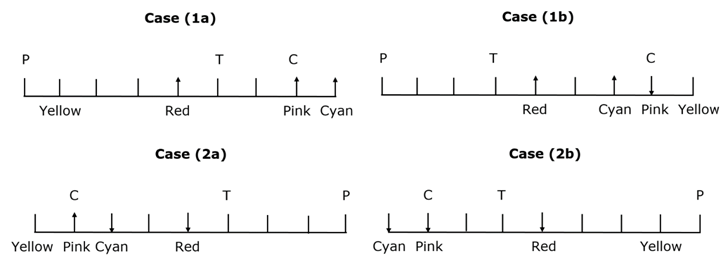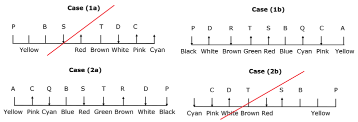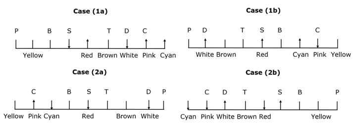 - D and one who likes Brown sits together, as P doesn’t sit adjacent to one who likes Brown, that means in case (1a) D sits immediate left of C, in case (1b) B sits immediate left of one who likes Cyan, in case (2a) B sits immediate right of one who likes Red, in case (2b) D sits immediate left of C.