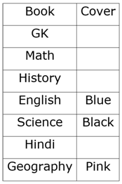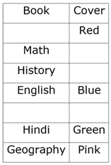 - Geography book having Pink cover is kept at any place below Hindi book, that means Geography book is kept at bottom.