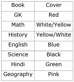 1) Seven books of different subjects viz. Math, English, Science, Hindi, History, GK and Geography having different cover says Red, Green, Blue, Black, White, Yellow and Pink are kept one above other on the self then, then how many books is/are kept between Yellow covered book and Science book?