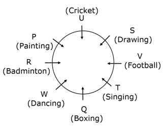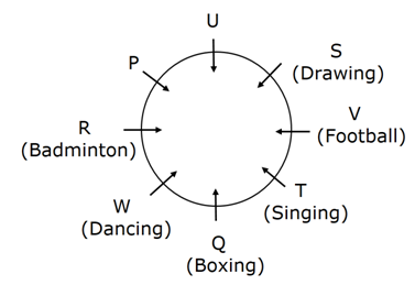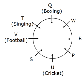 II) The one likes Boxing sits immediate right of W. Q sits third to left of S, who sits second to right of the one who likes Singing. U sits second to left of R, who sits second to left of the one who likes Boxing. The one who likes Dancing sits third to right of the one likes Painting, who sits second to right of V. P sits third to left Q, who like Boxing. T likes Singing and sits third to left of the one who likes Cricket.