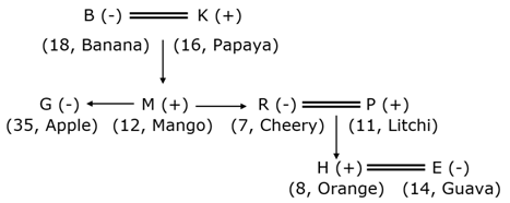 There are eight members in a family. Each likes different fruits viz. Guava, Apple, Mango, Banana, Papaya, Cheery, Litchi and Orange. Each person also has different number of 2 coins. B has 121 coins, she takes 18 coins and give remaining to her only son, who likes Mango. The one who likes Cheery takes 3/8thof coin from G. The one who likes Apple is sibling of R, who is mother of the one who likes Orange. K gives 56 coins to G, who is unmarried member of the family. M, who likes Mango, takes 12 coins and gives the remaining to his nephew H. Difference of value of coin from K to E is less than 4. The one who likes Cheery is only married child of B, who likes Banana. H takes 8 coins and gives the rest to his father who likes Litchi. The one who likes Guava is married to the one who likes Orange. P is one of the male members of the family. The one who likes Papaya is married to B and takes remaining 72 coins from the one who likes Litchi. Three married couples are there in the family. R gives 2/3rd of coin to her daughter-in-law.