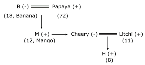- The one who likes Papaya is married to B and takes remaining 72 coins from the one who likes Litchi, since B is married to the one who likes Papaya, that means the one who likes Papaya is father of M and remaining coin with the one who likes Litchi is 11.
