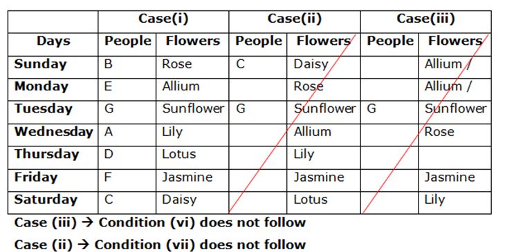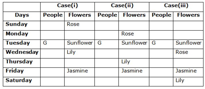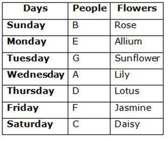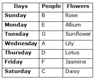 Seven persons namely – A, B, C, D, E, F and G are buying seven different flowers in seven different days in a week. The flowers are namely Lotus, Rose, Lily, Allium, Jasmine, Daisy and Sunflower. The week days starts from Sunday to Saturday. All the given information is not necessary to be in the same order.