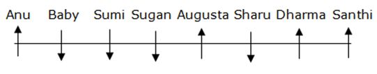 Anu is an immediate neighbour of Baby. Only Dharma sits between Sharu and Santhi. Santhi sits at one of the extreme ends of the line. Sumi is not an immediate neighbour of Augusta. Baby sits third to the left of Augusta. The immediate neighbours of Sharu face north direction. Santhi sits third to the right of Augusta. The immediate neighbours of Sugan face opposite direction to each other. Baby is not an immediate neighbour of Sugan. Anu faces north. The persons sitting at the extreme ends of the line face same direction.