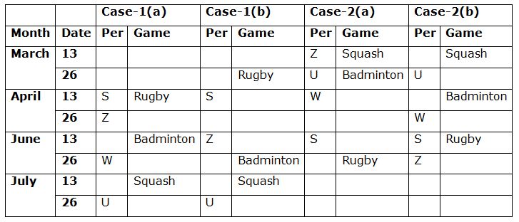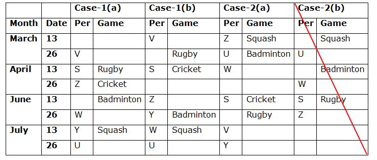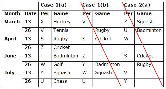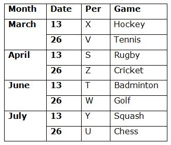 Eight persons S, T, U, V, W, X, Y and Z are attending the seminar on 13th and 26th of the four different months viz., March, April, June and July of the same year. They all like different games viz., Cricket, Chess, Golf, Hockey, Badminton, Squash, Tennis and Rugby but not necessary in the same order.