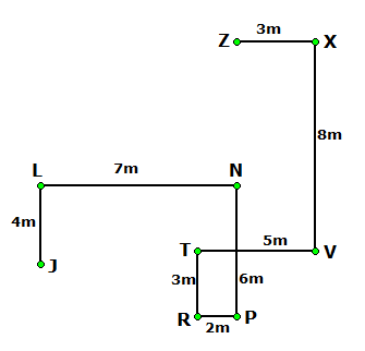 Point N is 7m to the east of point L, which is 4m to the north of point J. Point P is 6m to the south of point N. Point R is 2m to the west of point P. Point T is 5m to the west of point V and 3m to the north of point R. Point X is 8m to the north of point V. Point Z is 3m to the west of point X.