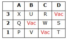 There are 3 floors with 4 flats in each of the floor at Lotus Apartments. Each flat in a floor is named A, B, C and D; the leftmost flat is named A and the rightmost flat is named as D as in alphabetical order. One of the flat in each floor is vacant. The lowermost floor is numbered 1 and the floor above is numbered 2 and so on. Nine people live in the apartment and not more than one live in a flat. R lives on Flat C of 3rd floor. W lives immediately below R’s flat in the same flat and it is an immediate neighbour of vacant flat. V’s flat is second to the left of T’s flat who lives in Flat D. X and Q lives on the same flat but on immediate floors. Q and V are immediate neighbours of vacant flat at different floors. X and W doesn’t live in the same floor. There is a vacant flat just below U, who lives in the same floor as X. There is no vacant flat – A in different floors. P lives in the floor immediately above S but on different flats.