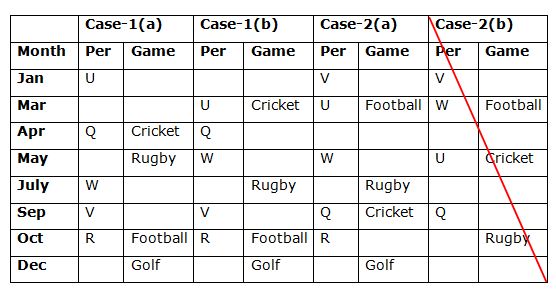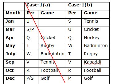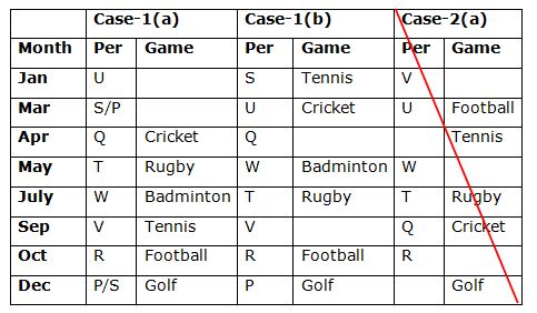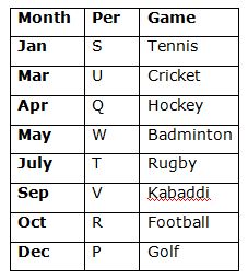 Eight persons P, Q, R, S, T, U, V and W are born in eight different months viz., January, March, April, May, July, September, October and December of the same year. They all likeS different games viz., Football, Badminton, Cricket, Tennis, Hockey, Rugby, Kabaddi and Golf but not necessary in the same order.