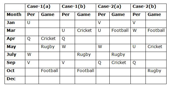 Only two persons are born between U and the one who likes Rugby. As many persons born after the one who likes Rugby is same as before W. U was born before the one who likes Rugby. W is not the eldest person. Only one person was born between W and the one who likes Cricket. V does not like Cricket. Q and the person who is born on December does not likes Rugby.